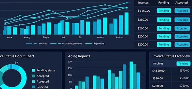 Web dashboard provides summaries (Daily/Weekly/Monthly/Yearly), trend charts for invoices and acknowledgements, reports by group, customer and ageing, pending deliveries tracking, rejected deliveries, bulk invoice upload, search, filter, and export to Excel/PDF.